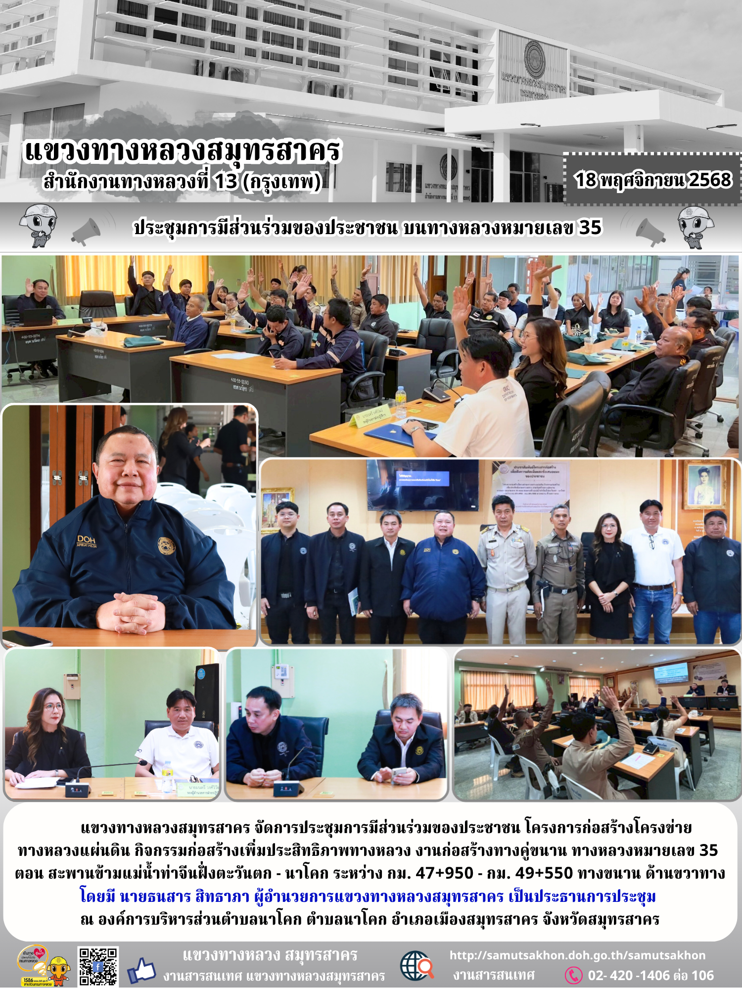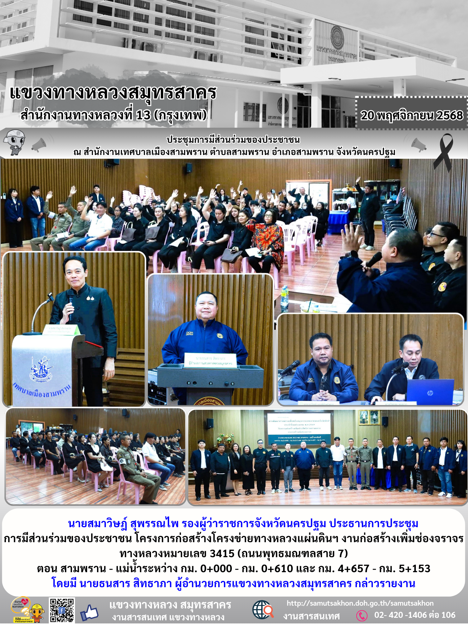 7 20/11/2568 แขวงทางหลวงสมุทรสาคร จัดการประชุมการมีส่วนร่วมของประชาชน โครงการก่อสร้างโครงข่ายทางหลวงแผ่นดิน กิจกรรมก่อสร้างเพิ่มประสิทธิภาพทางหลวง งานก่อสร้างเพิ่มช่องจราจร บนทางหลวงหมายเลข 3415 (ถนนพุทธมณฑลสาย 7)